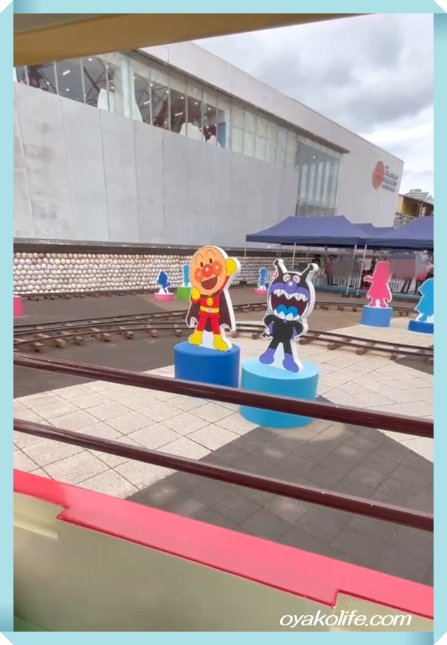 1歳でも安心して乗れるスピードで、アンパンマン、バイキンマン、ドキンちゃんなどアンパンマンキャラの間をレールトレインSLマンは走ります。